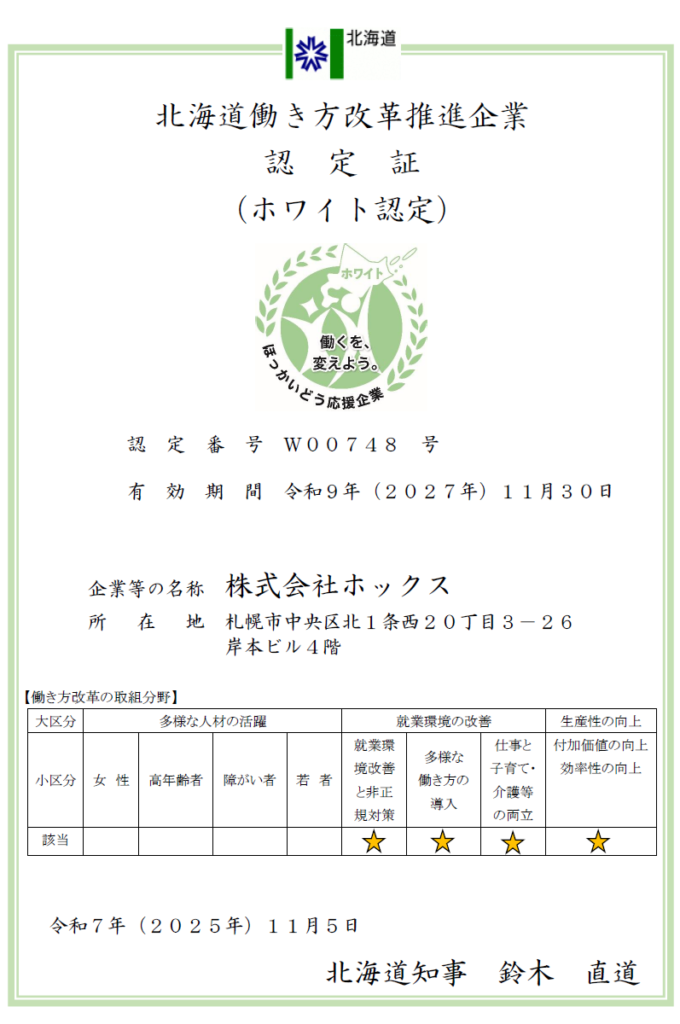 北海道働き方改革推進企業認定制度のホワイトに認定されました