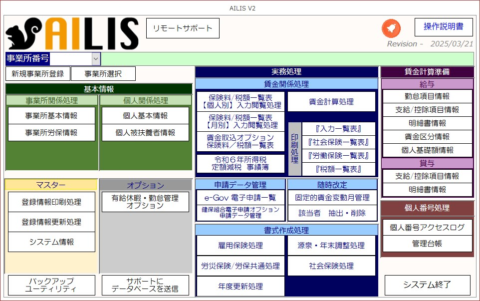 本システム「アイリス」は社会保険や労働保険の実務効率化を目的として作成されております。基本データ(事業所や個人における基本情報)を一元管理することにより、申請手続きへの自動転記や複雑な計算を迅速かつ正確に実行することによる業務の効率化が可能となっております。