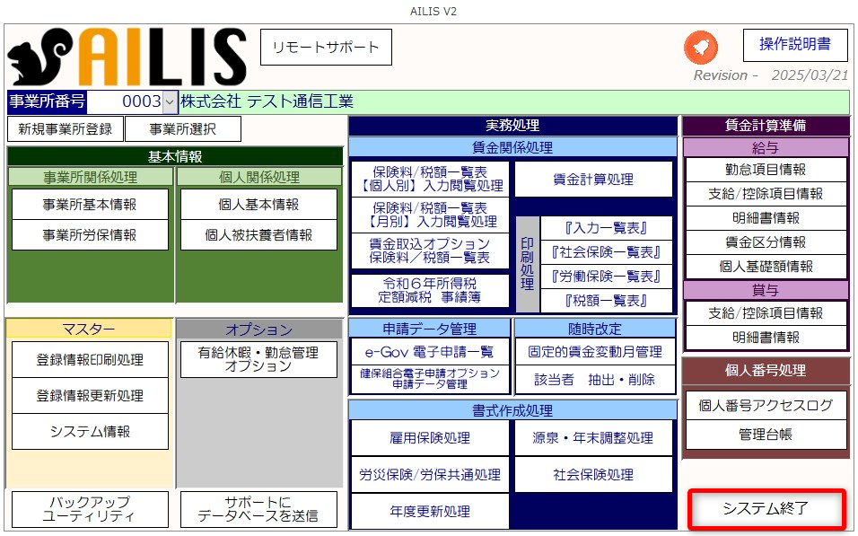 システムを終了する場合は不測の事態の場合を除き、必ず上記の手順にて終了してください。 各画面等から直接Windows ボタンの[×(閉じる)]を利用して終了した場合、データが正常に登録されない危険性がございますのでご注意ください。