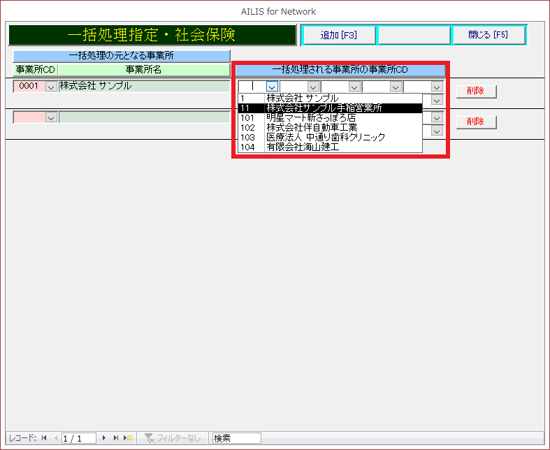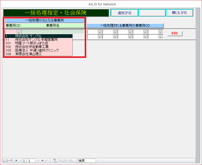 一括処理指定・労働保険、一括処理指定・社会保険画面では別々に登録されている事業所の労働保険・社会保険を1つの事業所として処理することができます。(継続事業の一括、一括適用等)