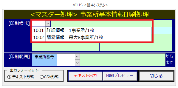 アイリス独自の様式において、登録した事業所情報を印刷できます。また、テキスト出力機能において、CSV形式のデータ出力も可能です。