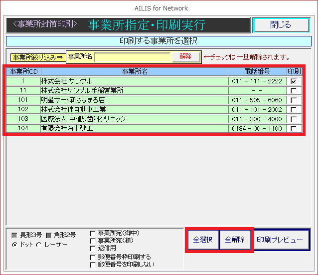 ※[全選択]・[全解除]のほか、事業所の絞り込み機能もございます。
