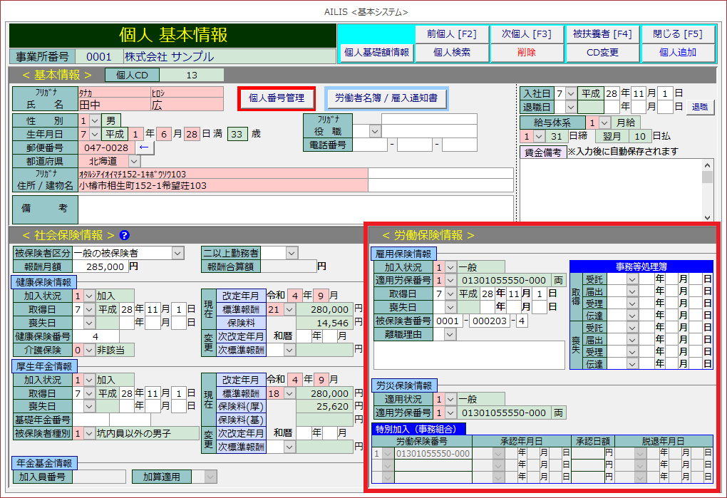 使用者・労働者の個人に関する情報は[個人基本情報]において入力・管理します。個人基本情報画面では労働者・使用者といった個人の情報を編集できます。