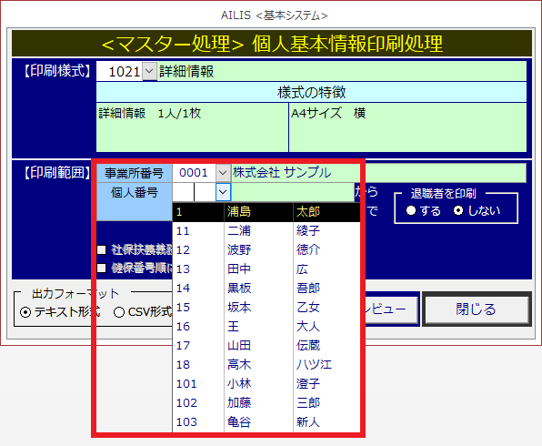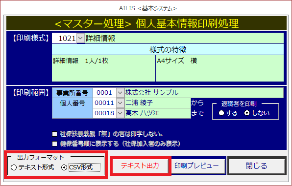 アイリス独自の様式において、登録した個人情報を印刷できます。また、テキスト出力機能において、CSV形式のデータ出力も可能です。