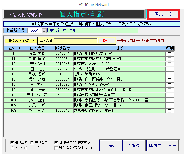 [全選択][全解除]のほか、氏名の絞り込み機能もございます。