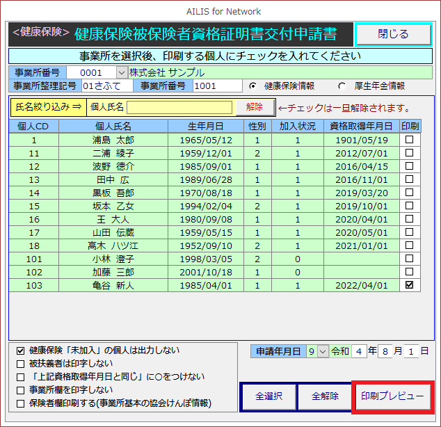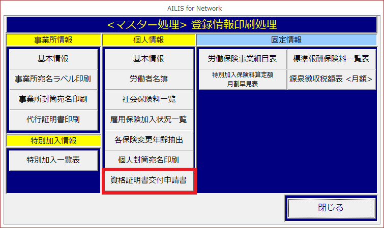 次の画面においても社会保険の資格取得・喪失証明書を印刷できますので参照ください。