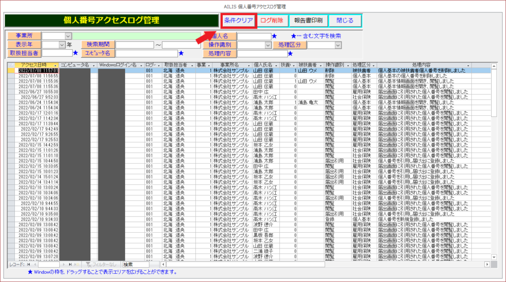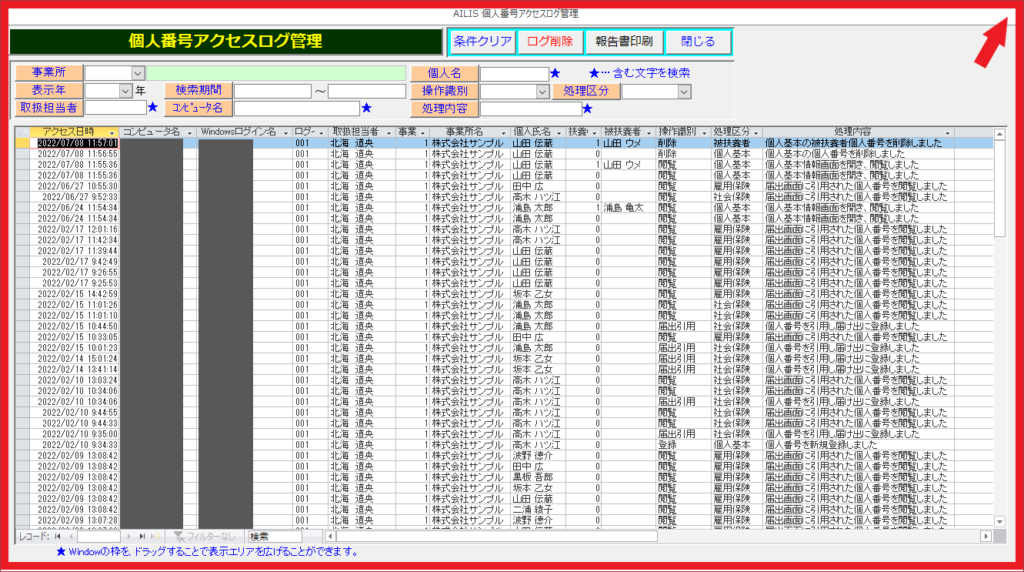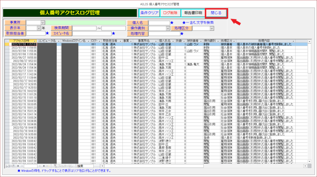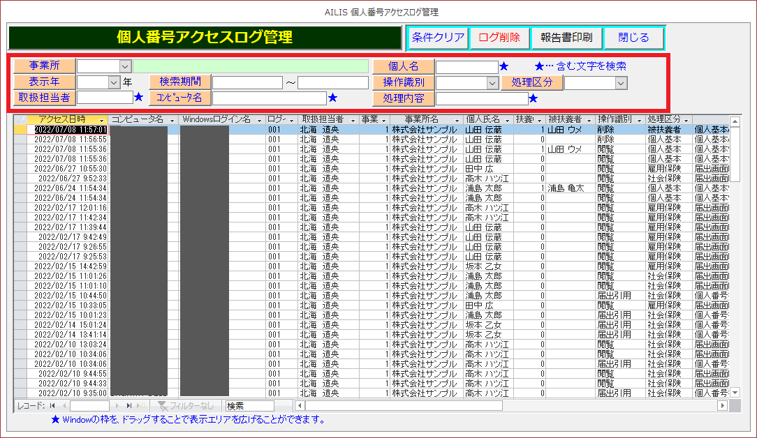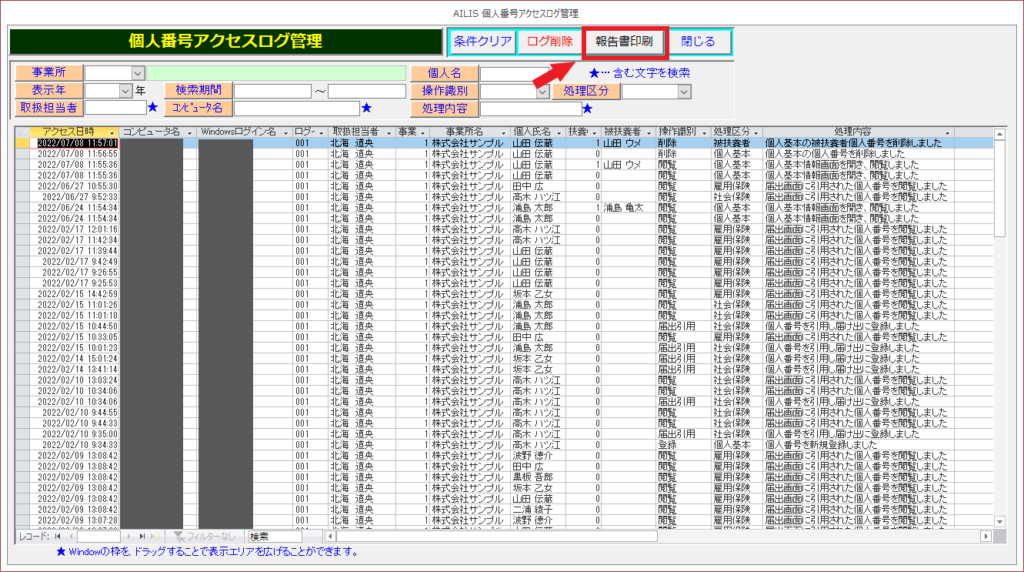 個人番号の登録・修正・削除・閲覧により記録されたアクセスログの検索・表示、報告書印刷などの処理が確認できます。