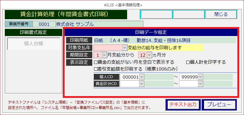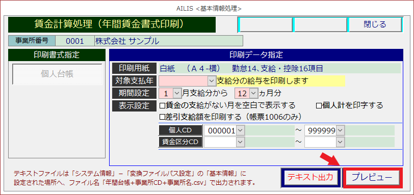 年間表示の賃金台帳を印刷する方法を紹介します。
