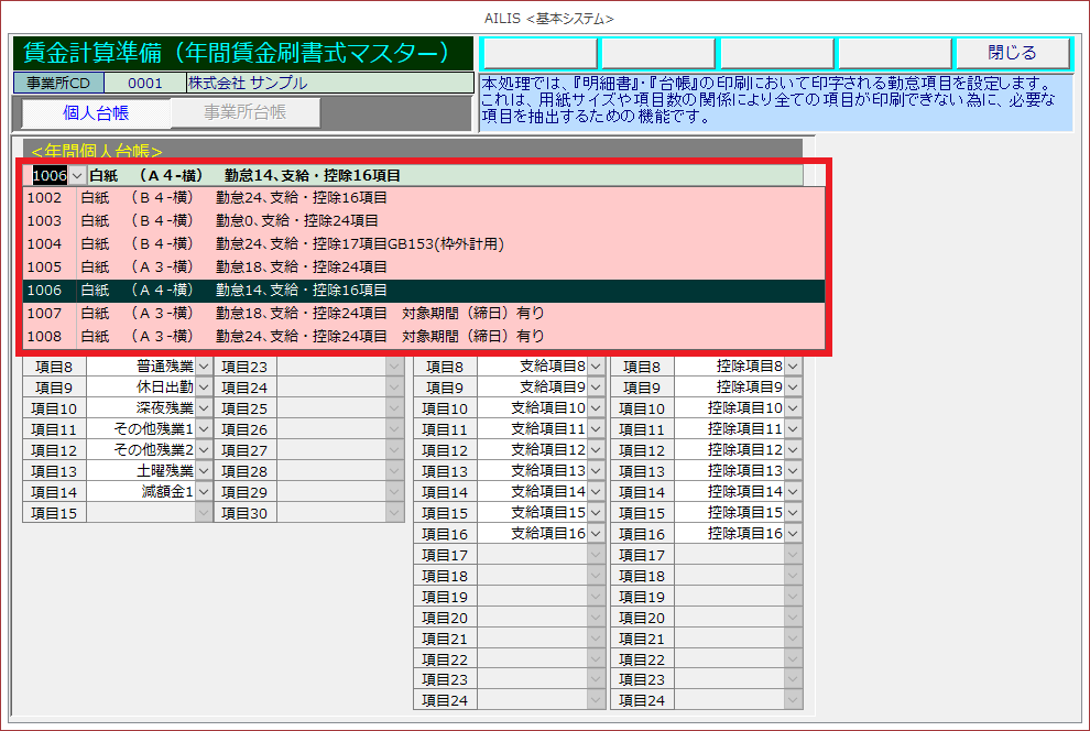 ※年間台帳では支給項目、控除項目の自由な選択や設定はできません。