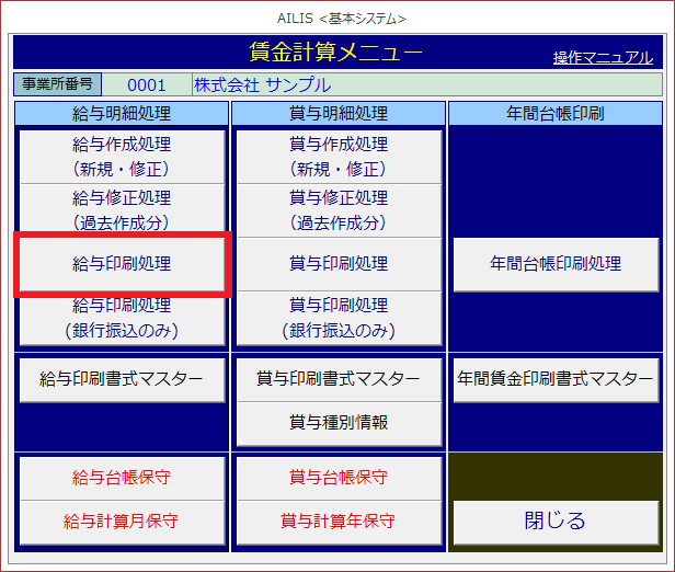 | [給与印刷処理] | 給与計算後の賃金台帳や給与明細書を印刷します。 |