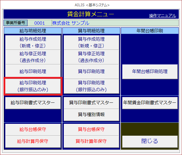 | [給与印刷処理(銀行振込のみ)] | 銀行振込に対応した様式を印刷します。 |