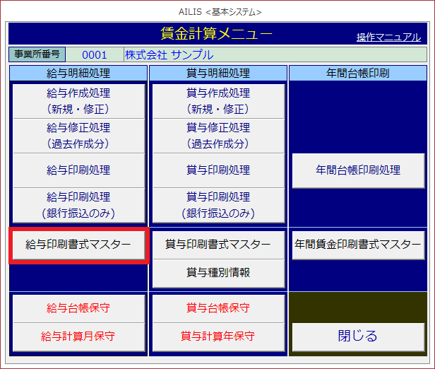 | [給与印刷書式マスター] | 印刷する賃金台帳や給与明細書の設定を行います。 |