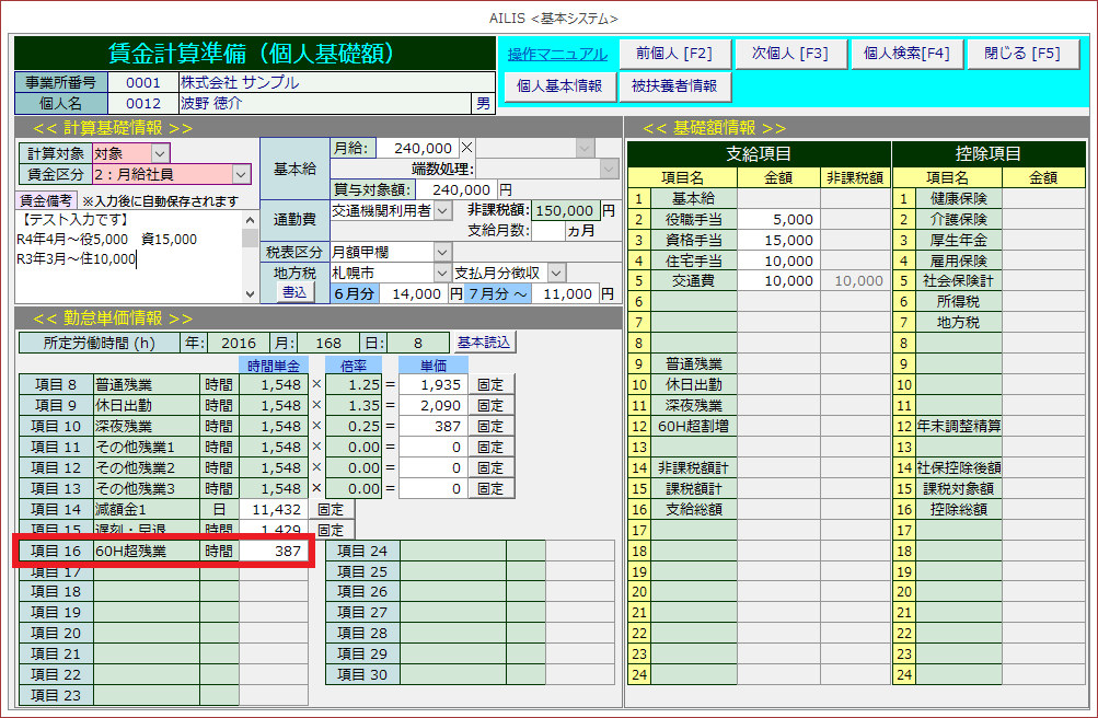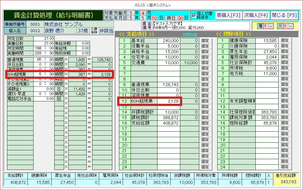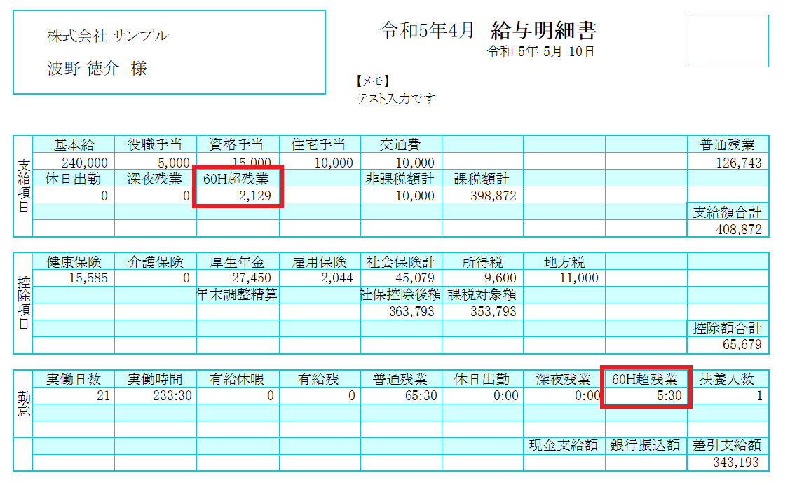 ②勤怠項目に60H超残業時間数を入力し、支給項目に正しい計算結果が自動計算されているか確認します。