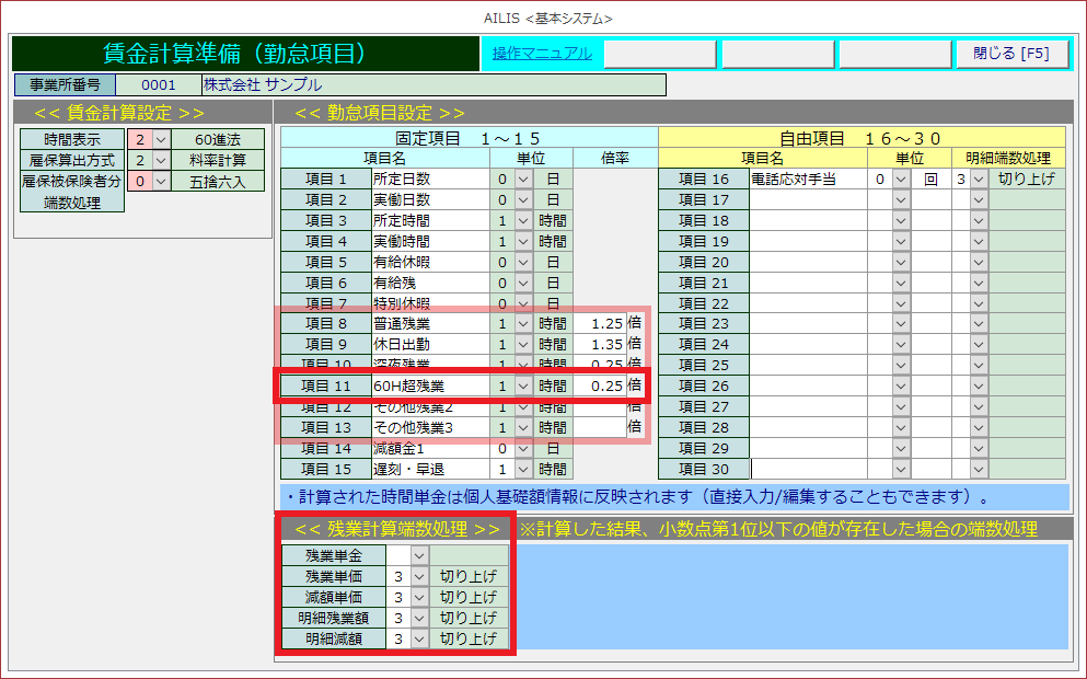 ※画像例では項目11を使い、時間外割増の上乗せ分として0.25倍としています。