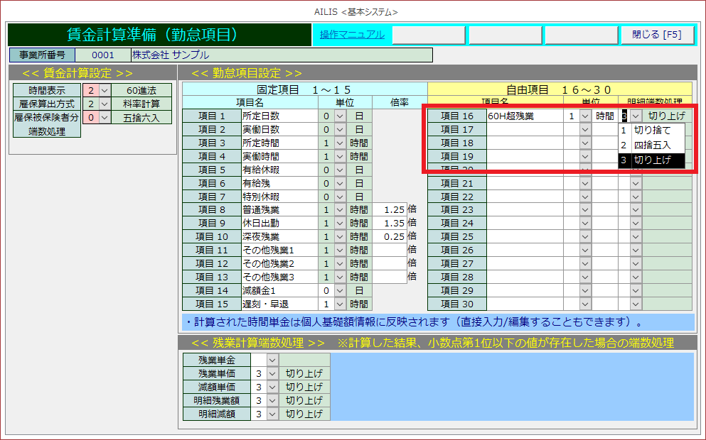 ※明細端数処理とは、時間×単価で計算した支給額の端数処理のことです。