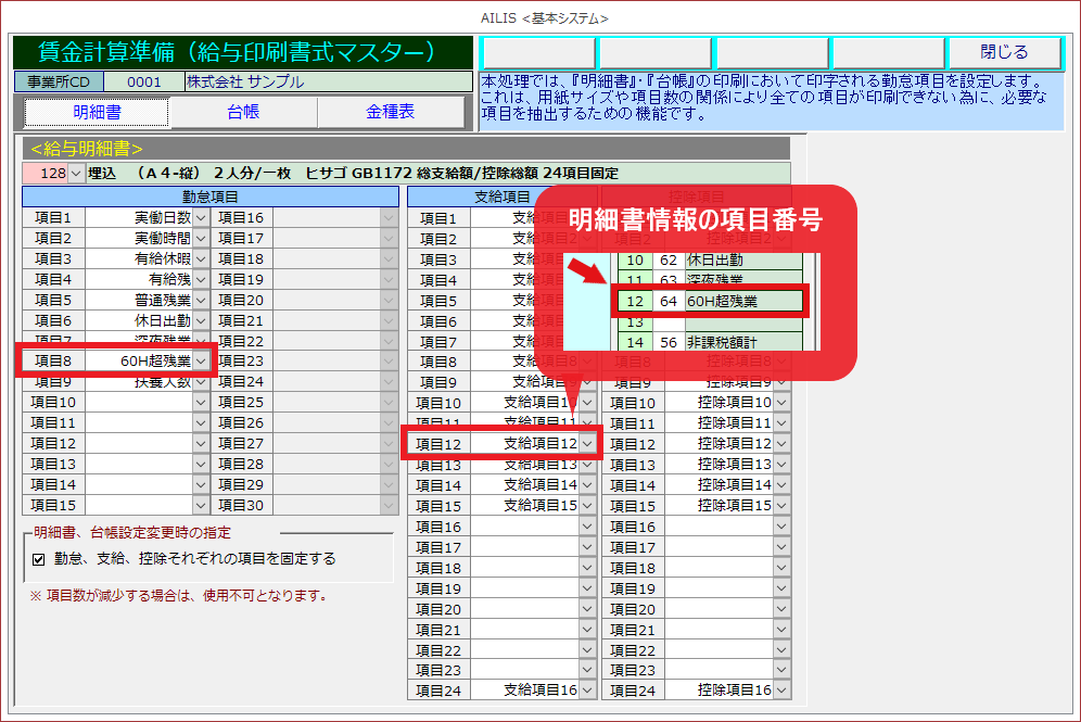 ※画像例では、勤怠項目に「60H超残業」、支給項目に支給項目12を設定しています。