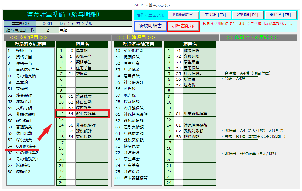 ※画像例では、支給項目64を明細書に登録しました。