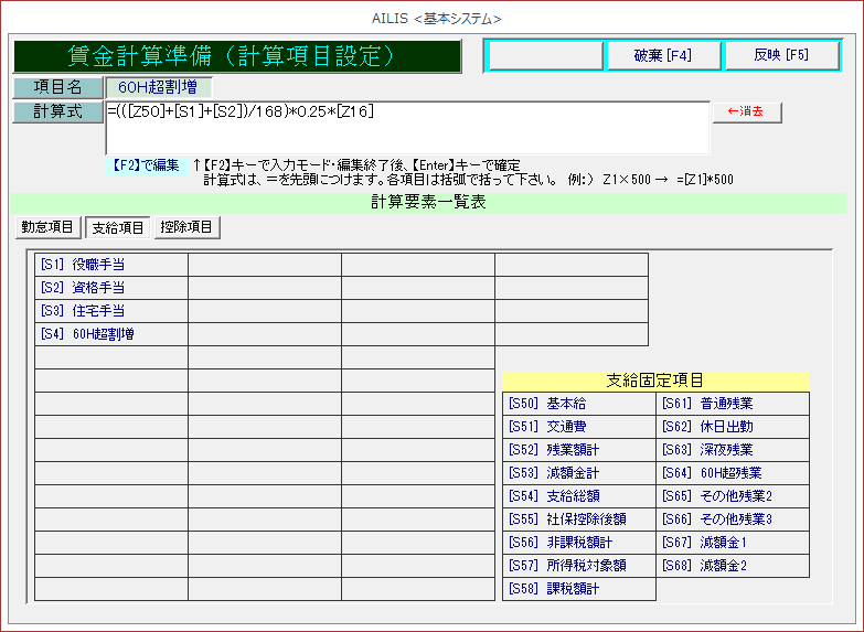 計算式の例:=(([Z50]+[S1]+[S2])/168)*0.25*[Z16]