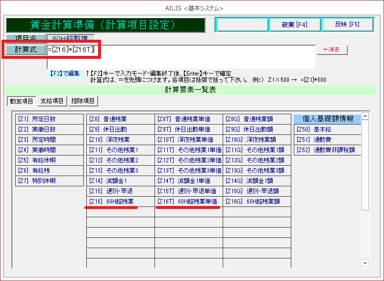 [Z16]は賃金計算で入力する勤怠の時間数、[Z16T]は個人基礎額情報に登録した単価額です。