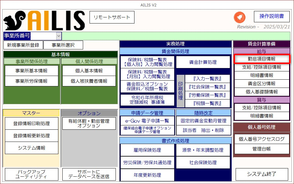 ①メインメニュー画面より、賃金計算準備・[勤怠項目情報]を選択します。