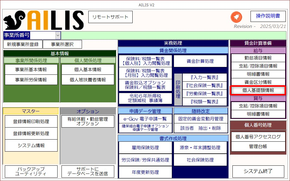 ①メインメニュー画面より、賃金計算準備・[個人基礎額情報]を選択します。