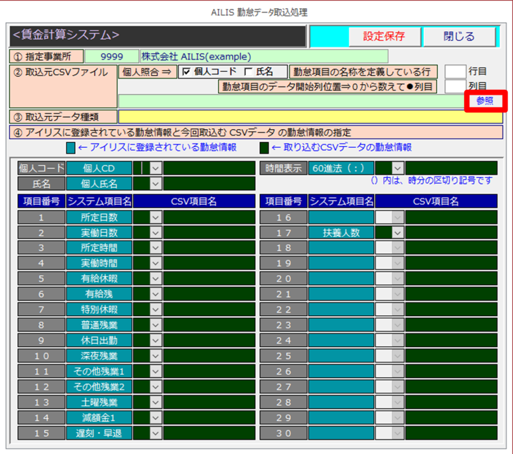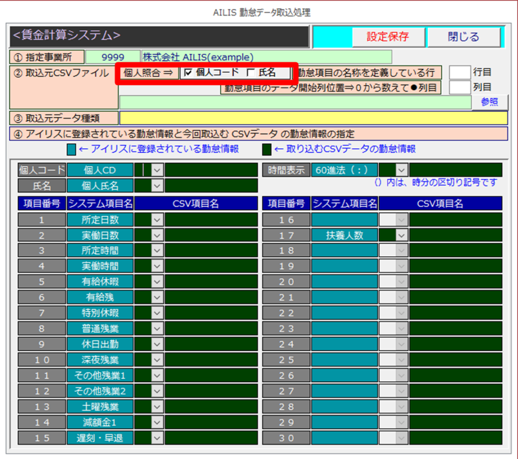 - 個人コード:アイリスの個人CDとCSVのデータ(社員番号など)を照合したい場合に選択
