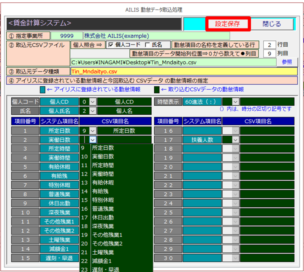 画像の例ですと、アイリスの実働日数欄に、CSVの項目(10 実働日数)を設定するところです。