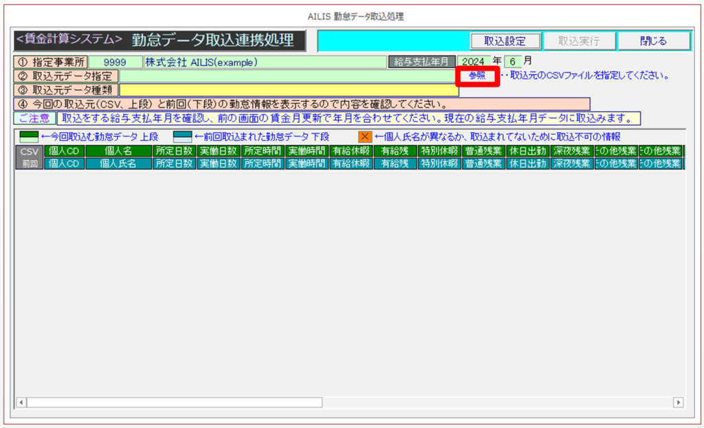 ①勤怠取込画面を開き、給与支払年月を確認した後は[参照]から取込するCSVを選択します。