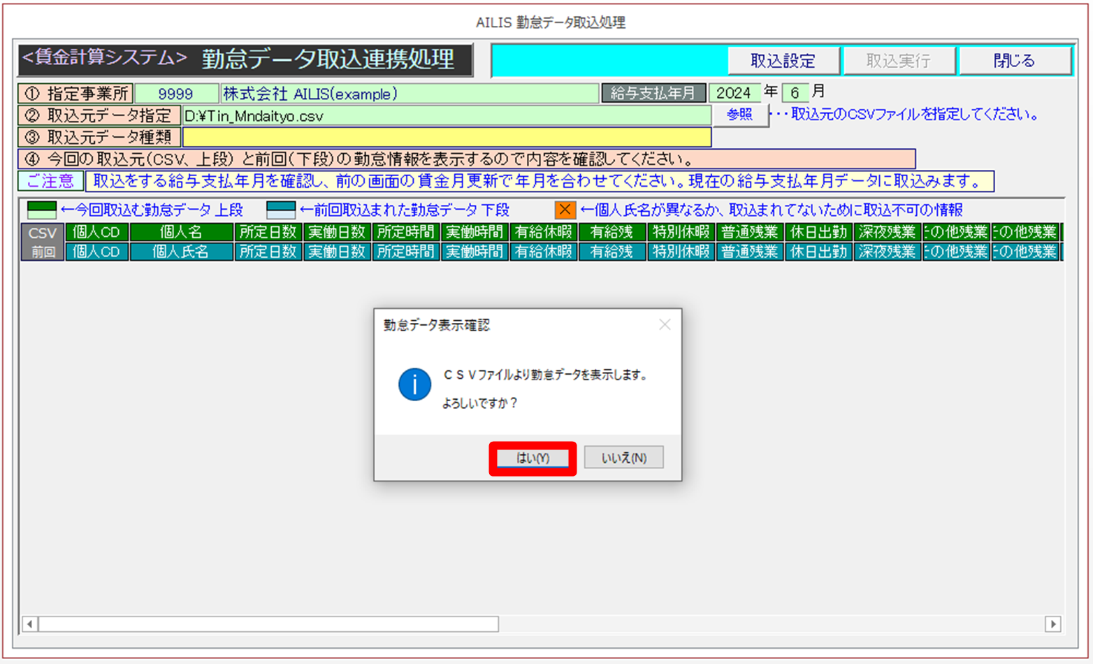 ②勤怠データ表示確認は[はい]を選択します。