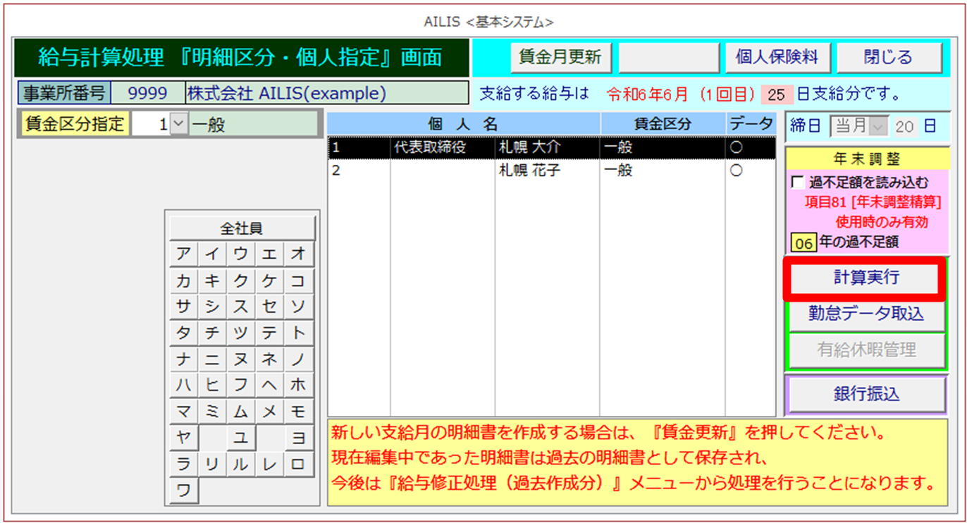 ①アイリストップメニューの[賃金計算処理]を選択します。