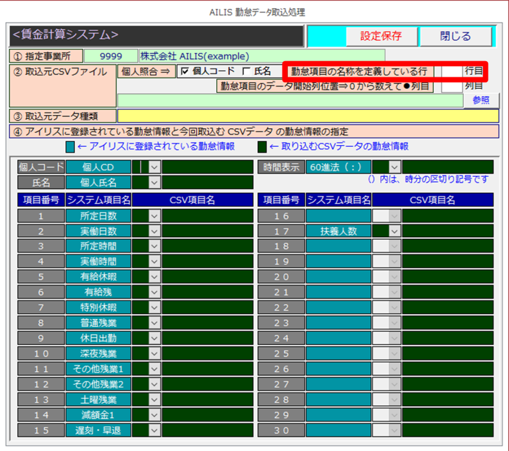 ②取込予定のCSVを開き、[勤怠項目の名称を定義している行]を設定します。