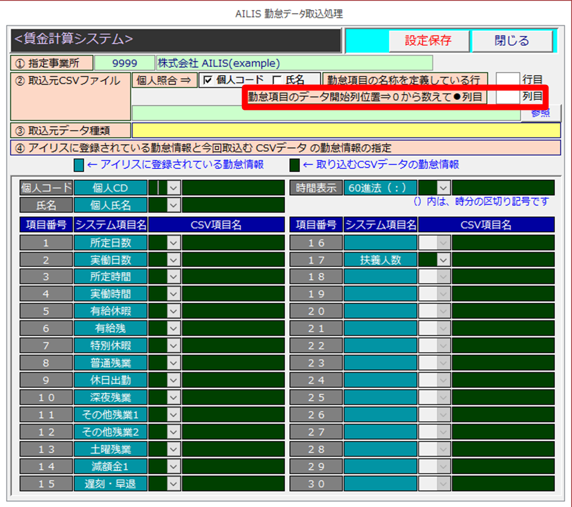 ③取込予定のCSVを開き、[勤怠項目のデータ開始列位置⇒0から数えて●列目]を設定します。
