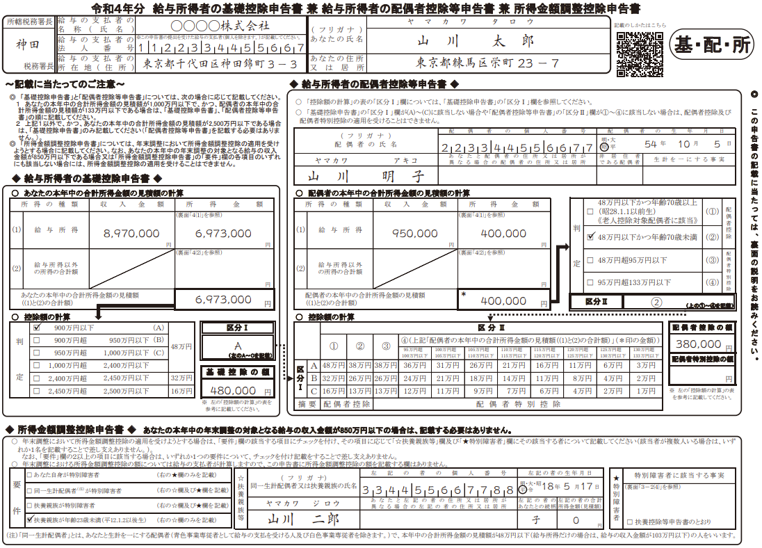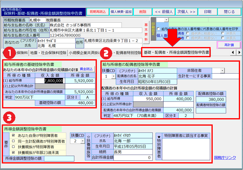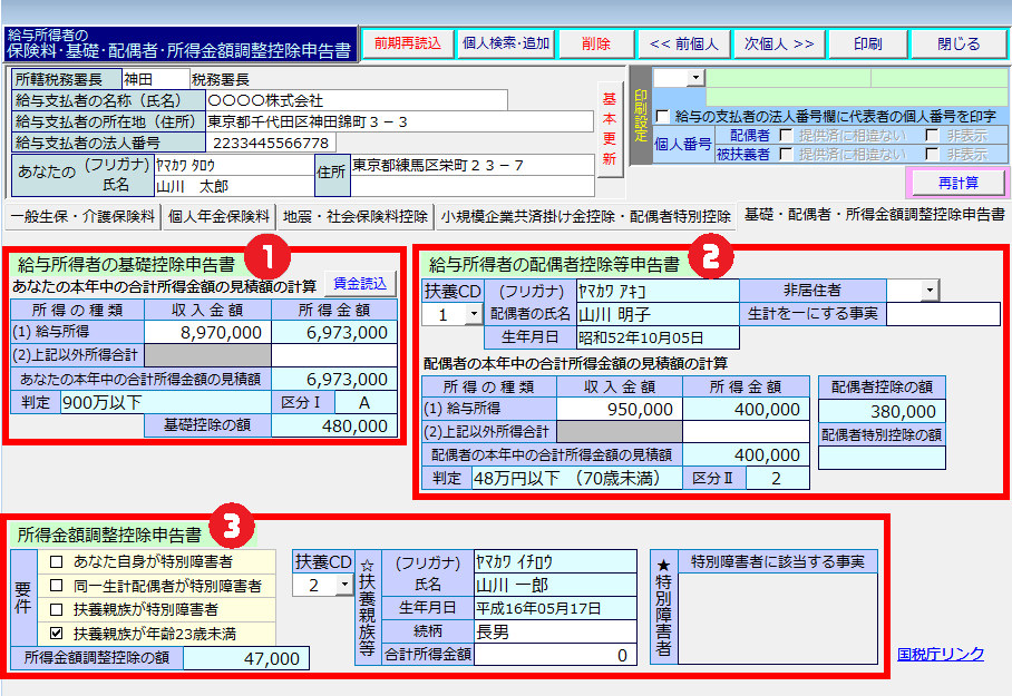 基礎・配偶者・所得金額調整控除申告書の入力