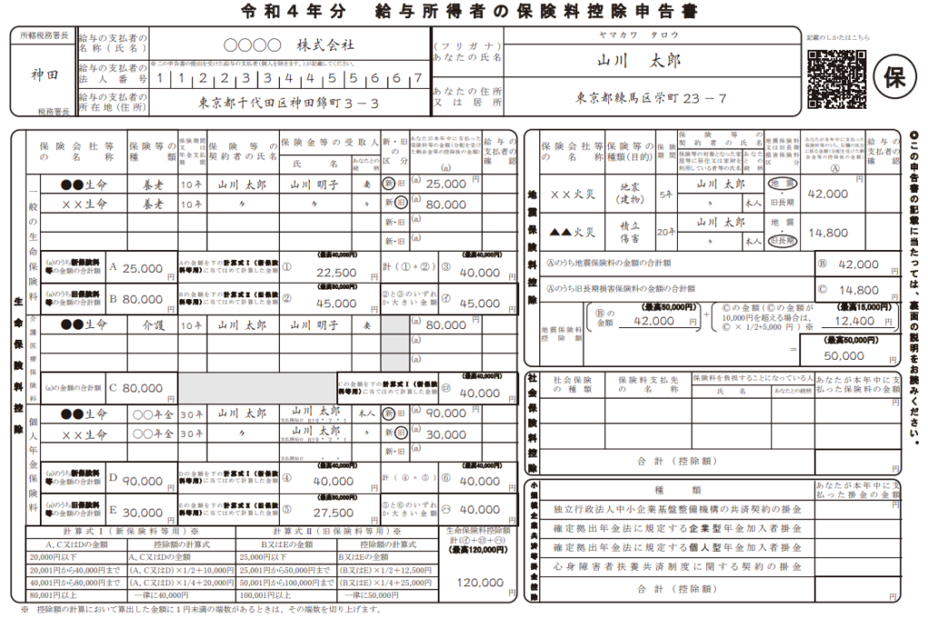 ◆次の画像「保険料申告書の入力方法 国税庁ホームページより[記載例]」を例に、情報の入力箇所を説明します。