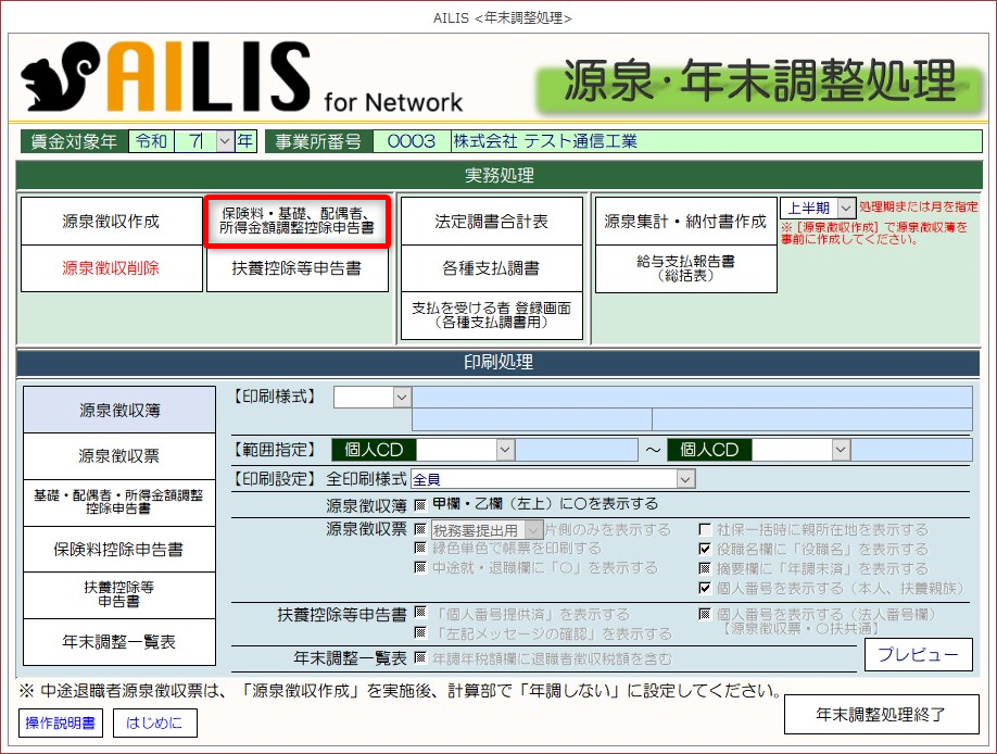 基礎・配偶者・所得金額調整控除申告書の印刷