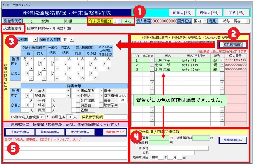 - 源泉徴収票の扶養親族または16歳未満扶養親族欄が5人以上15人以内の場合は「赤丸5」の[扶養親族書込]を選択することで反映されます。人数が超える場合は「赤丸5」の[源泉徴収票・概要欄]に直接入力してください。