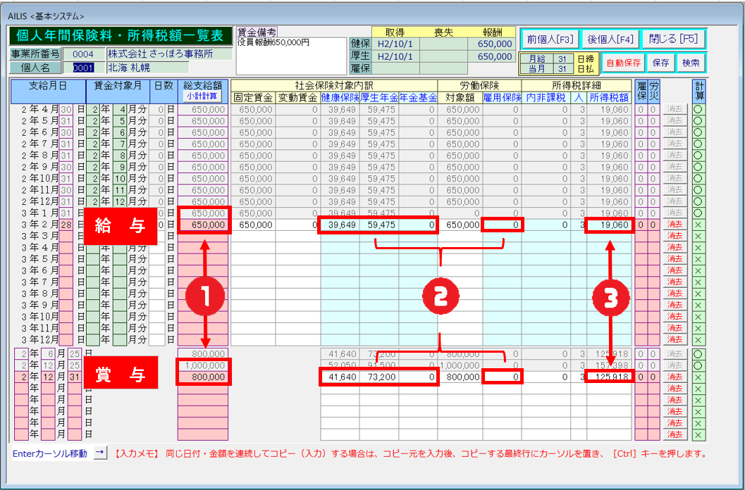 - 前画像の②の社会保険料の合計額が次画像の②へ反映されます。