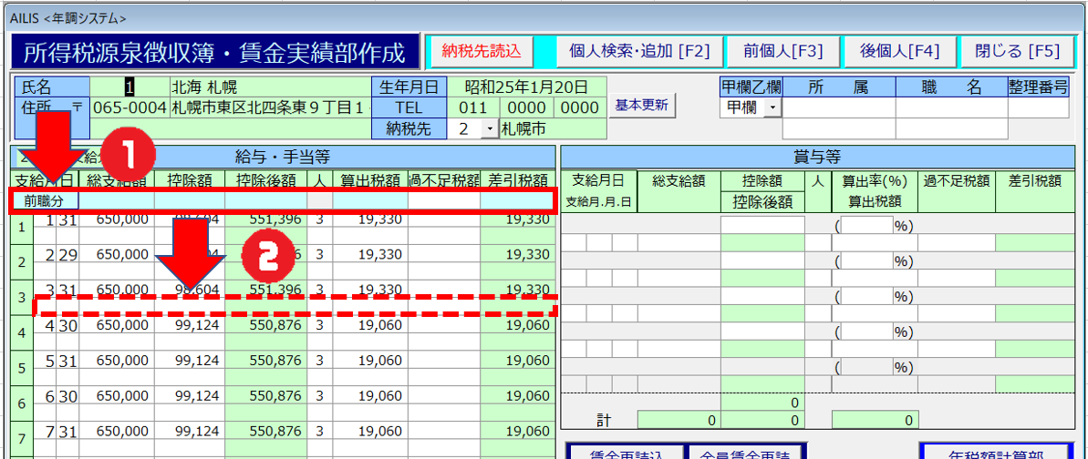 ②対象年において前職分等の源泉徴収がある場合は、次の画像①に記した[前職分]に入力します。また、月内に2回以上の支払いがあった場合は、次の画像②に記した枠に2回目以降の金額を合計して入力します。
