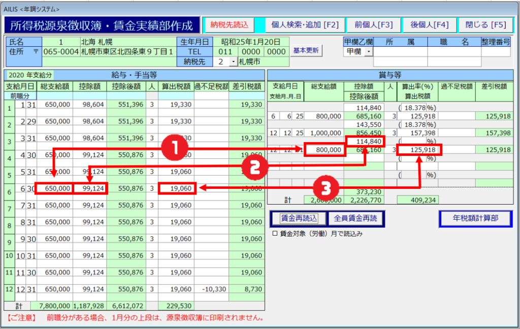 - 前画像の③の所得税額が次画像の③へ反映されます。