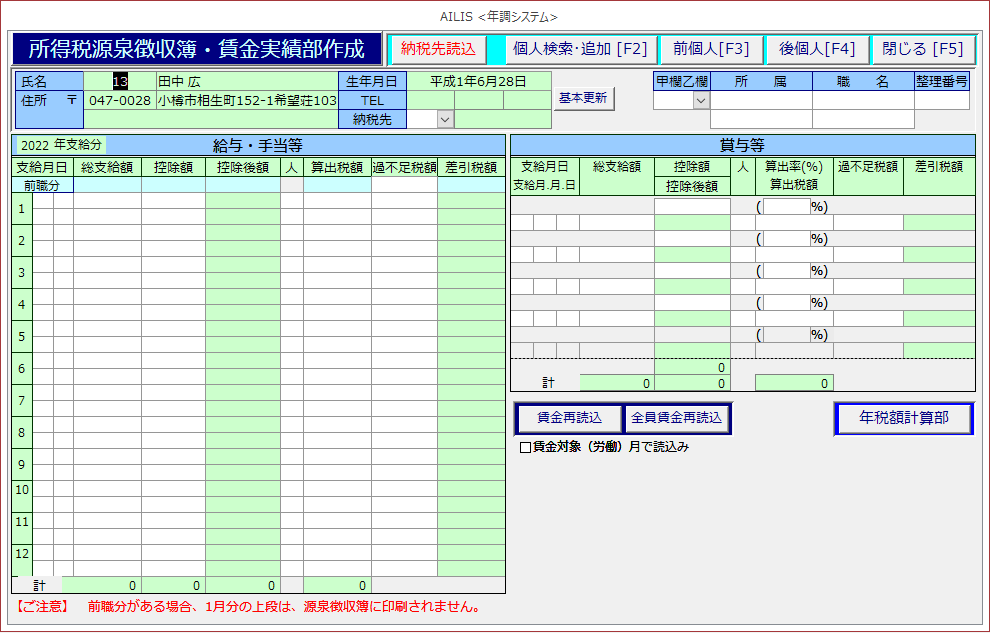 ④追加した方の所得税源泉簿・賃金実績部作成画面が開きます。