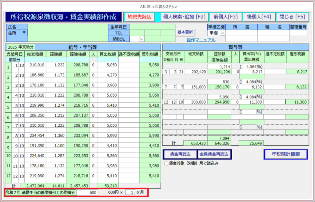アイリスで賃金計算をしていない事業所:「令和7年通勤手当の限度額引上の差額分」欄に直接入力してください。