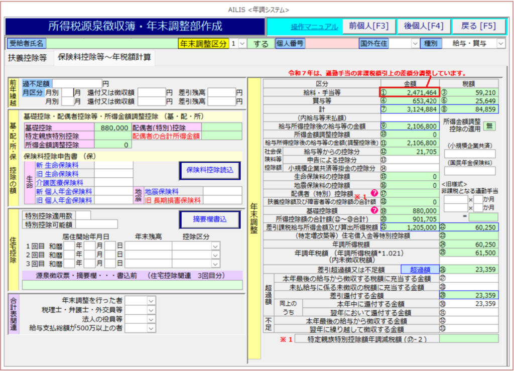 源泉徴収簿①欄が2,471,464円に変更されていることをご確認ください。