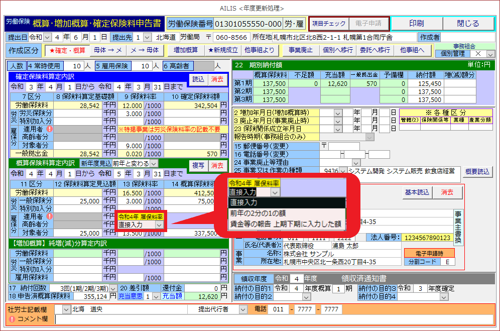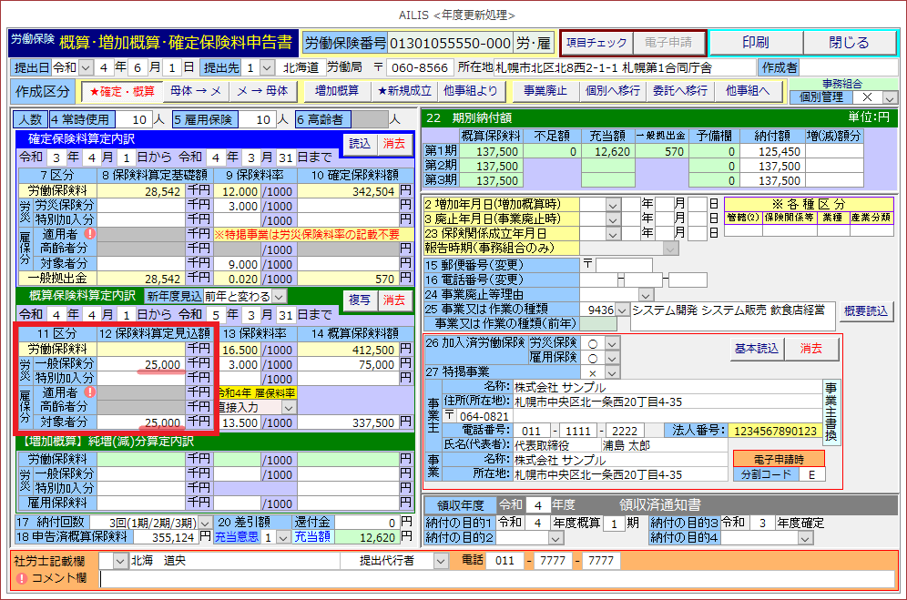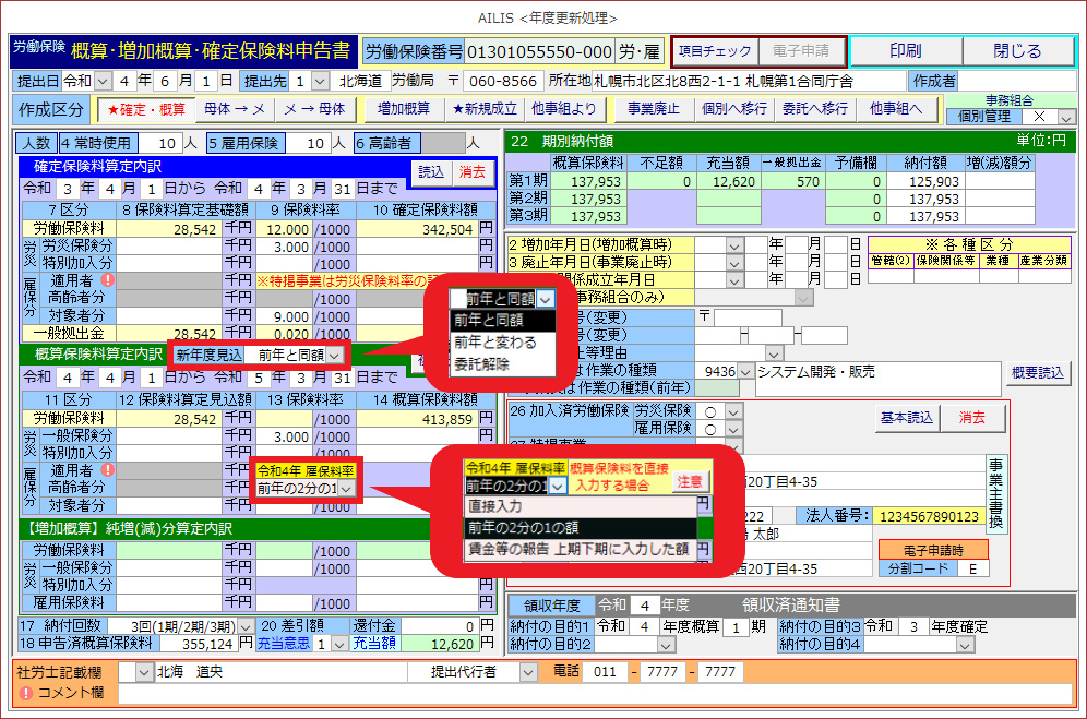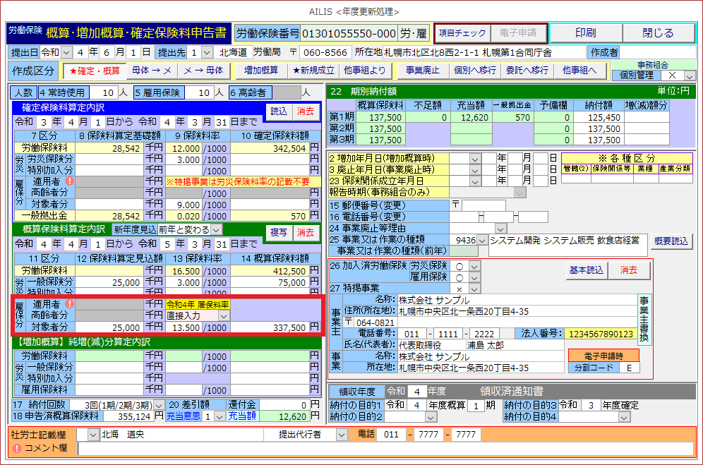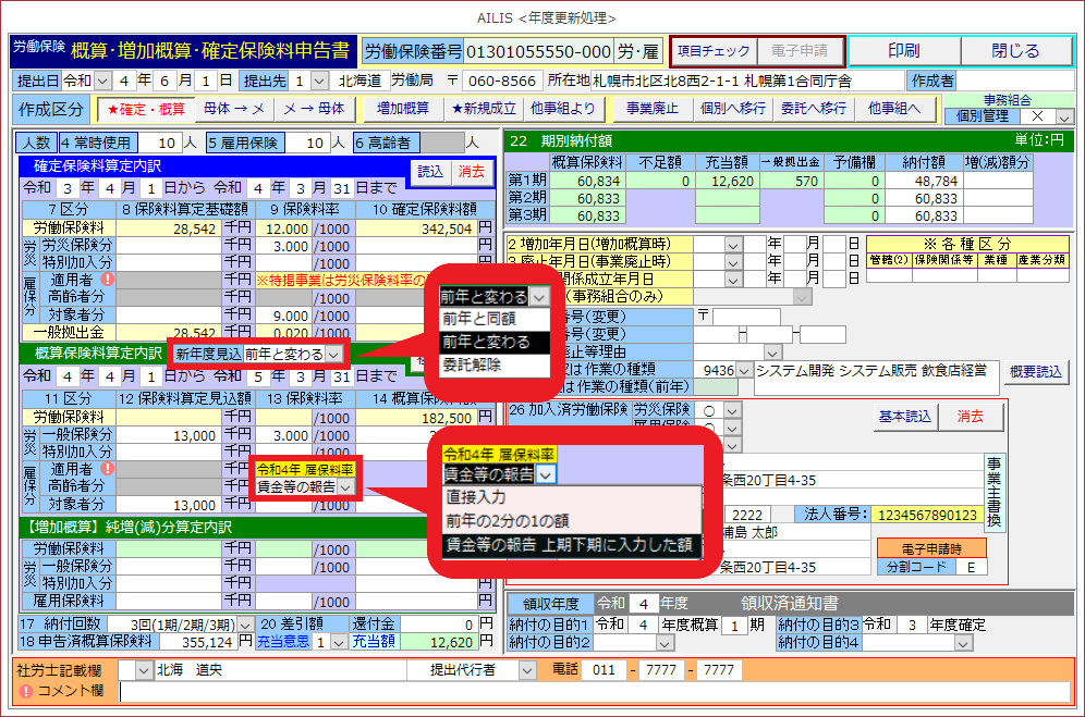 令和4年度において、年度の途中で雇用保険料率が変更される予定であることから、アイリスでは賃金総額の見込額を3種類の方法で入力できるように対応しておりますので、該当となる操作方法をご参照ください。