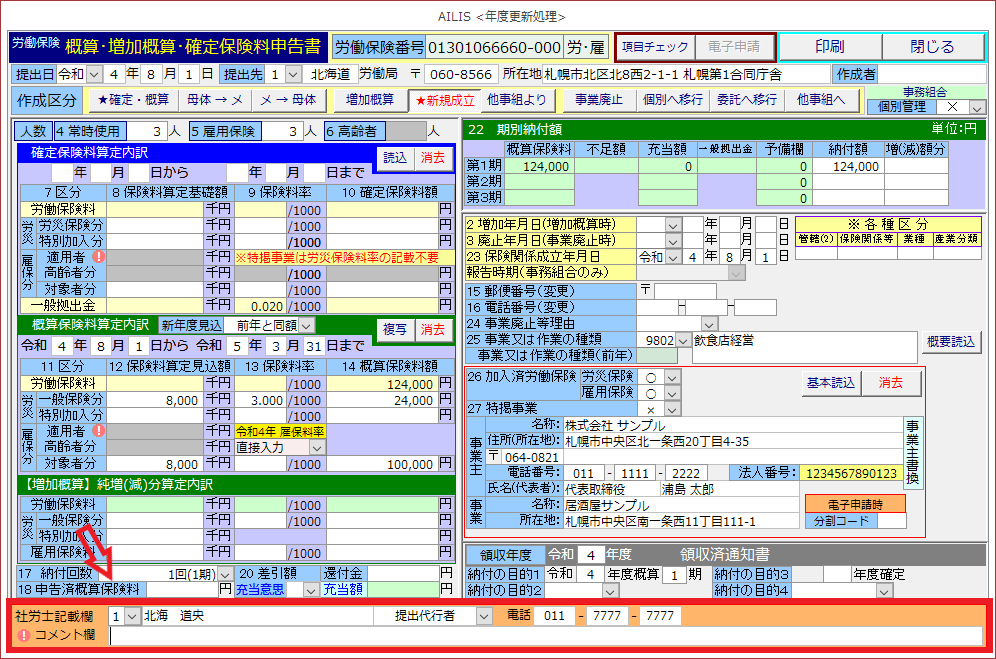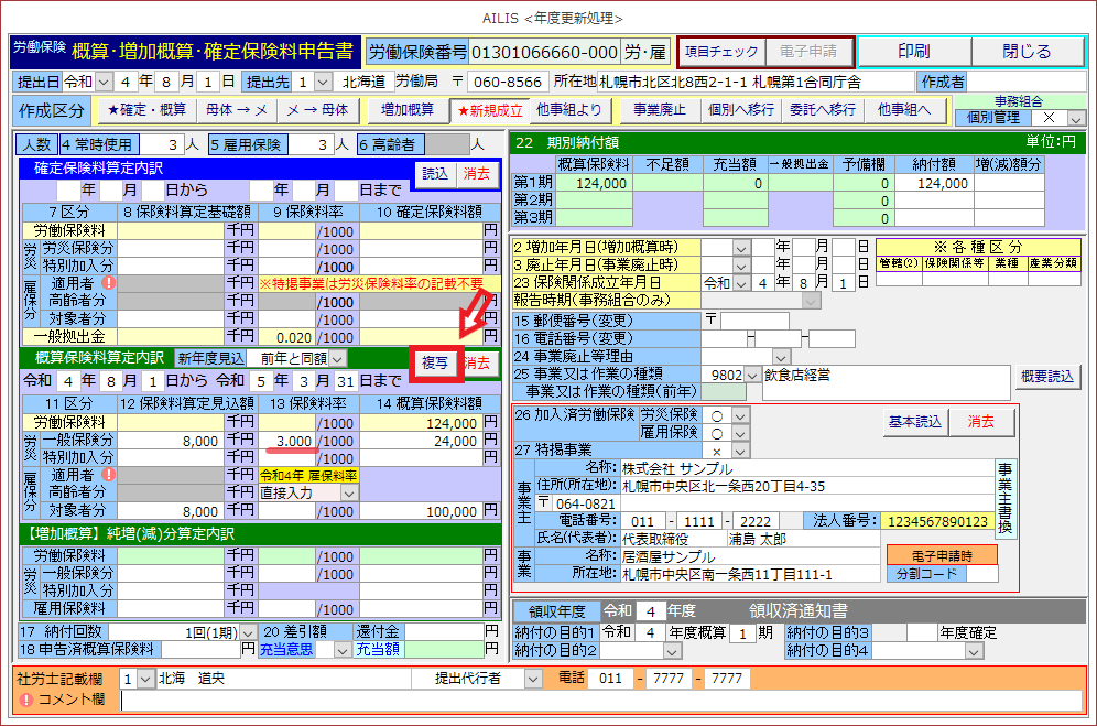 ①労災/雇用の「保険料算定見込額」が同額の場合には、雇用保険料率の変動のため、概算保険料額をそれぞれに手入力が必要です