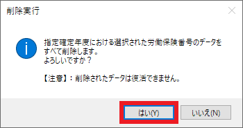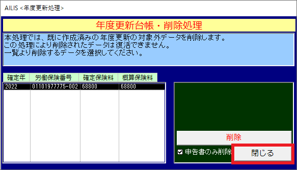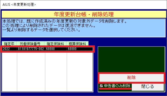 ※[申告書のみ削除]のチェックを外した場合、[保険料申告書(甲)]のデータに加えて、[確定労働保険料集計(基礎賃金等の報告)][一括有期事業報告書(建設の事業)]など、関連するデータをすべて削除します。