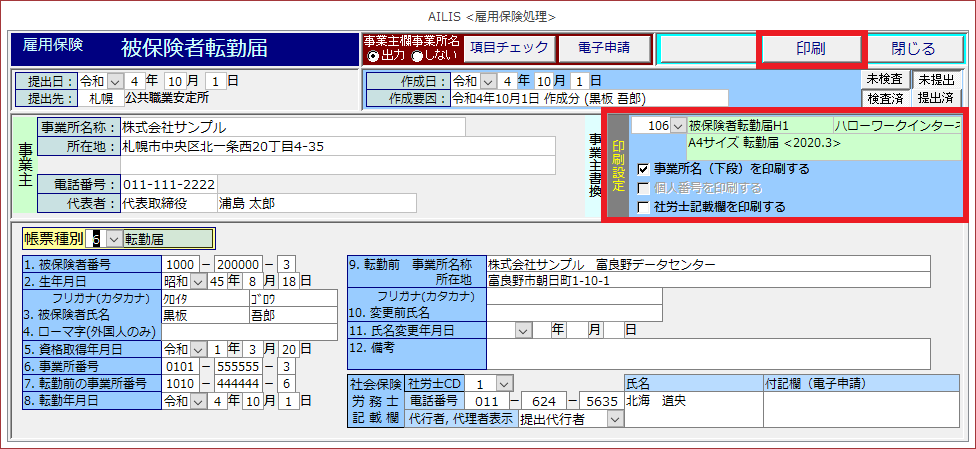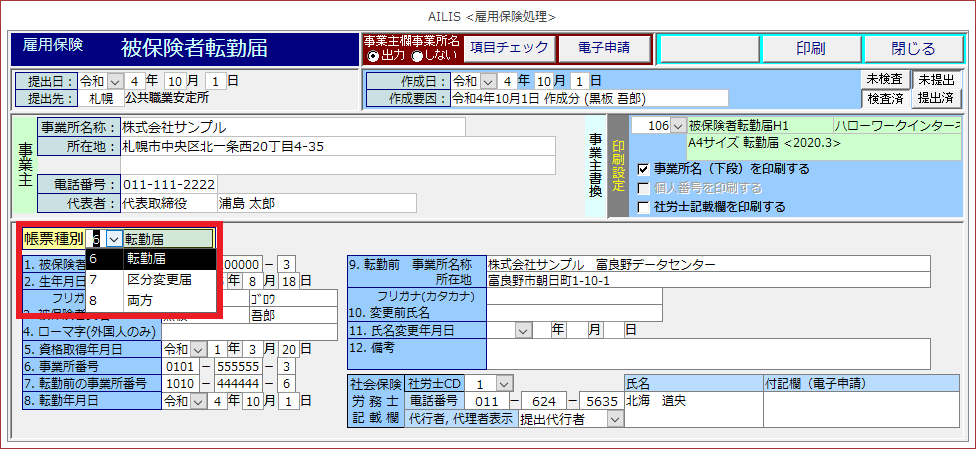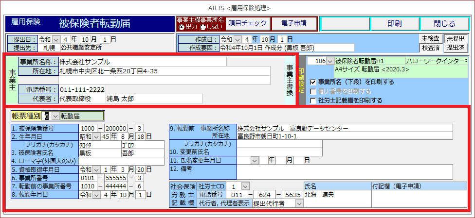 このページでは、雇用保険被保険者転勤届の入力・印刷・電子申請方法の手順を紹介します。