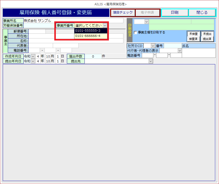 ③[届出書]を選択します。本画面では事業所番号と登録状況を絞込できます。
