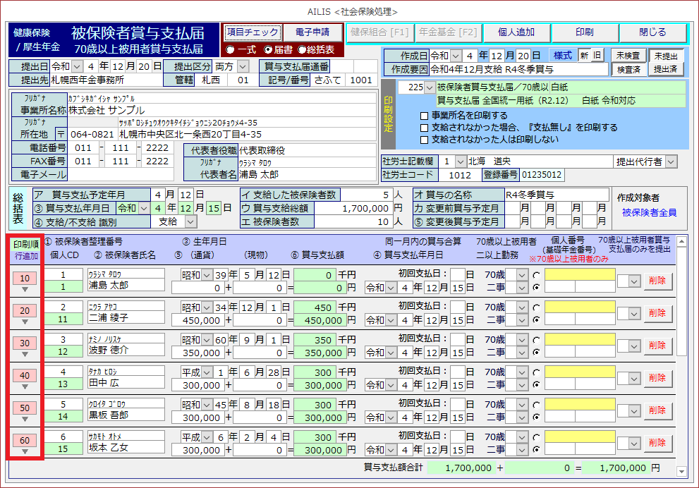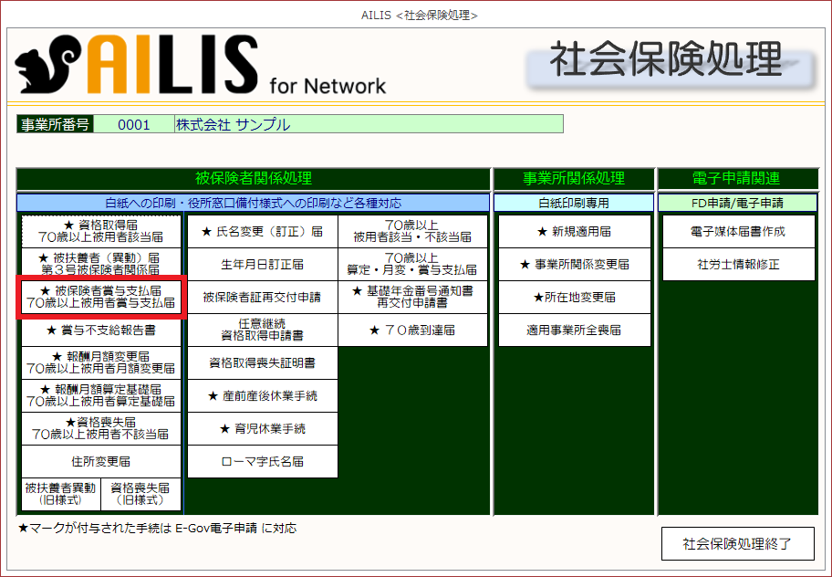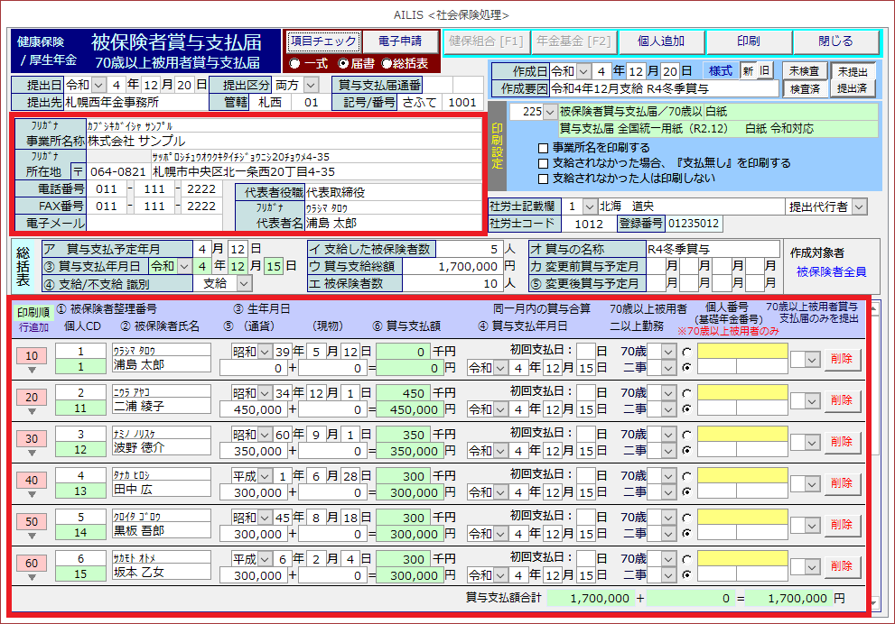 このページでは、健康保険・厚生年金保険被保険者賞与支払届/厚生年金保険 70歳以上被用者賞与支払届の入力・印刷・電子申請方法の手順を紹介します。