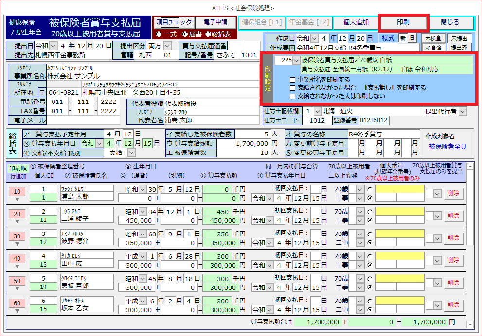 - 賞与支払額が0円 のデータは「電子申請」データが作成されません