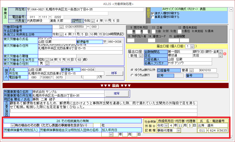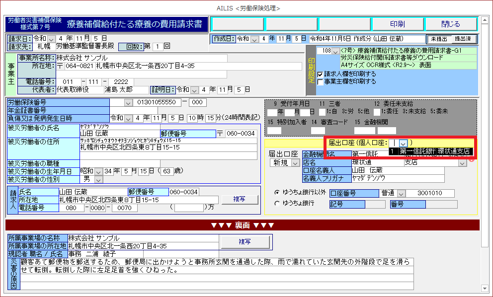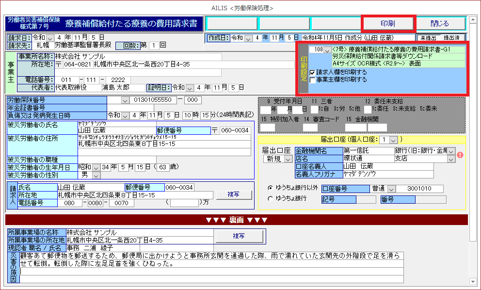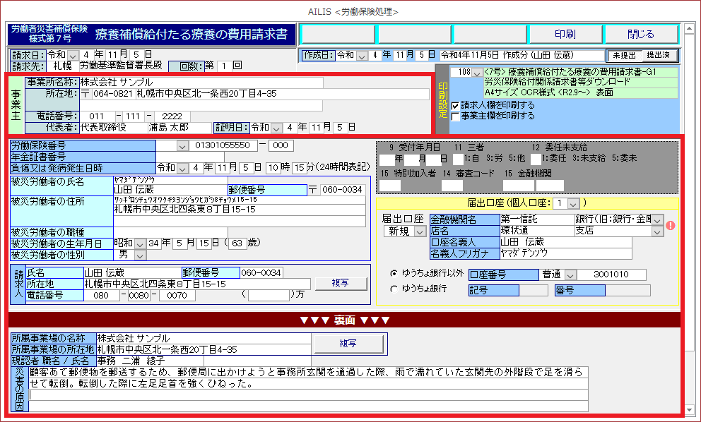 このページでは、療養の費用請求書(様式第7号(1)、様式第7号(2)、様式第16号の5(1)、様式第16号の5(2))の入力・印刷方法の手順を紹介します。
